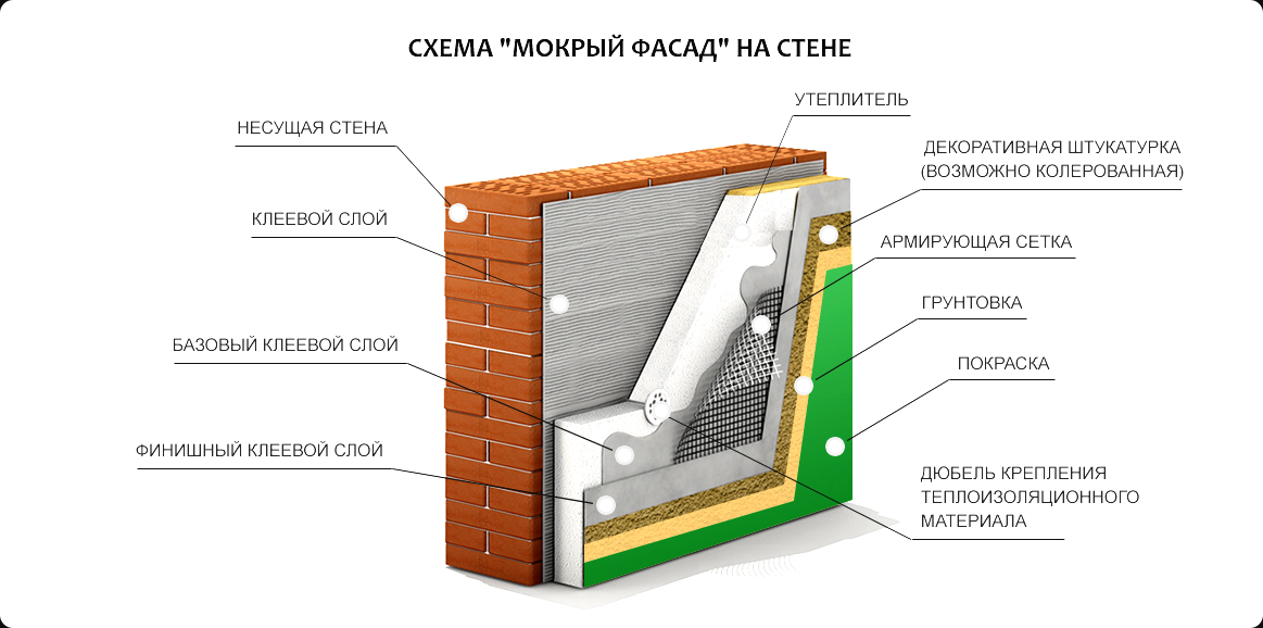 В составе мокрого фасада есть три основных слоя: